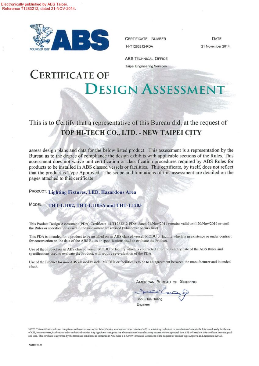 久鑫的防爆LED燈系列有三款產品已通過ABS (American Bureau of Shipping)認證,產品型號分別為L1203 (20W)、L1105 (40W , 60W)以及L1102 (60W, 80W, 100W)。
